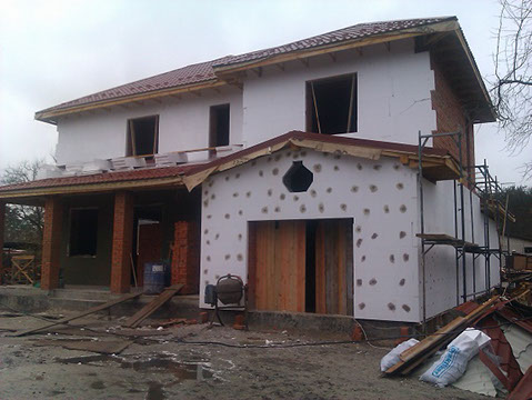 В данном случае утепление происходит слоями: утеплитель-армирующая сетка-финишная штукатурка. Способ достаточно трудозатратный и работы могут выполняться только при плюсовых температурах и в хорошую погоду.